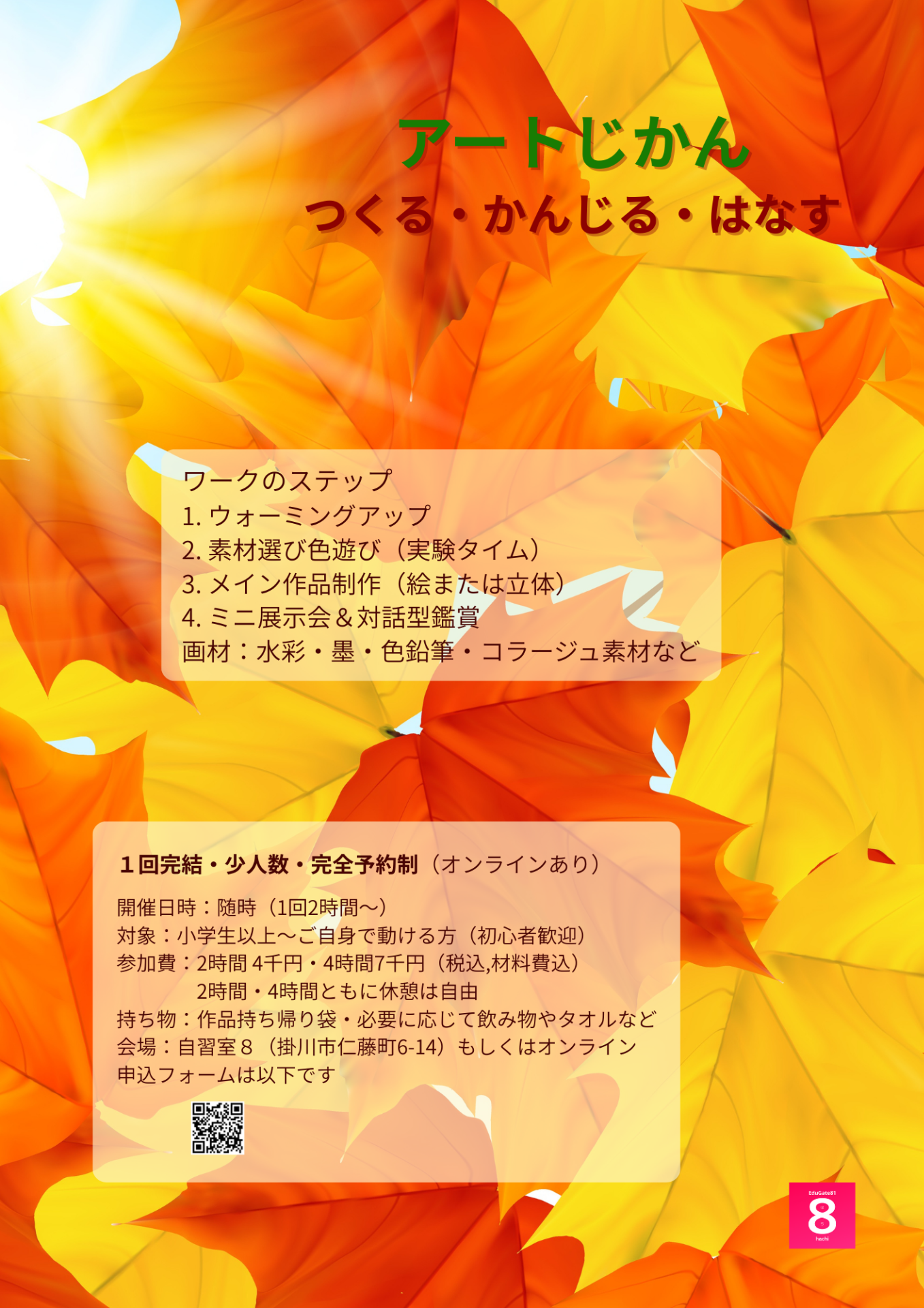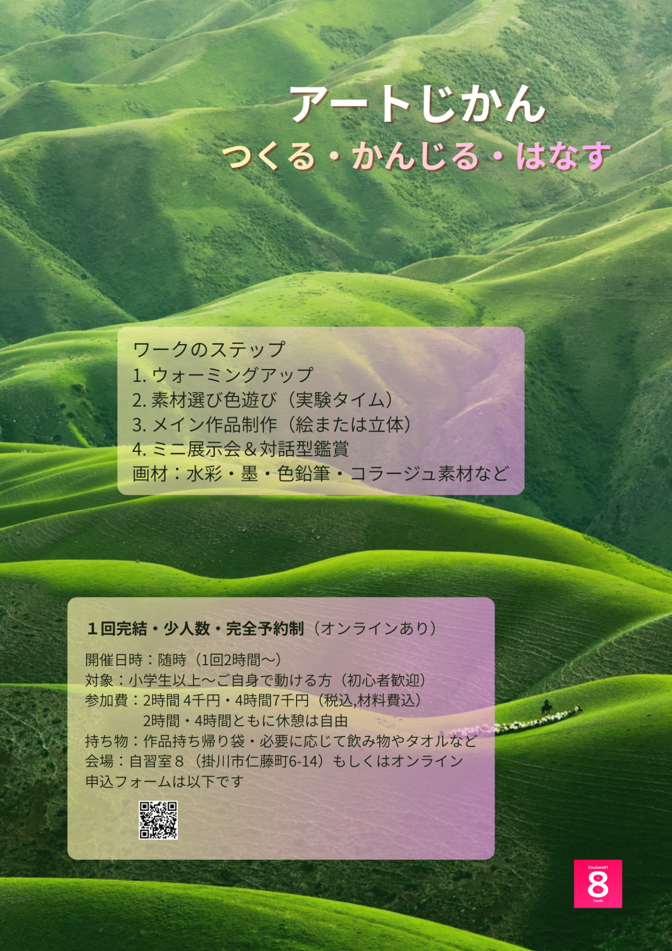 「アートじかん」とは、情報にあふれた日常を送る子どもたち、些末なことで心がすり減る大人たち、記憶の変化に不安を感じる方々、そして「なにか新しいことを始めてみたい」と思っている方など、すべての方にひらかれた穏やかな創作の時間です。手を動かし、色や形に触れながら、思考から少し離れて自分の感覚に向き合うことで、心と体がふっとほどけるような状態を味わっていただけたらと思います。経験や年齢は問いません。表現することの楽しさと、静かで満たされた時間を過ごしてみませんか。